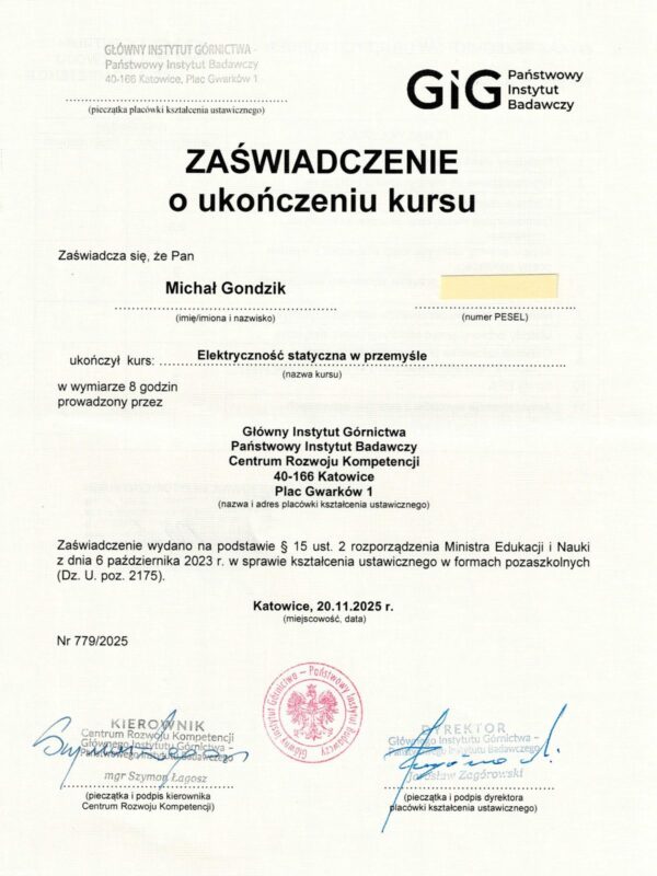 Miło mi poinformować, że ukończyłem kurs w Głównym Instytucie Górnictwa dotyczący elektryczności statycznej. Kolejna dawka specjalistycznej wiedzy, która przełoży się na jeszcze wyższy poziom...